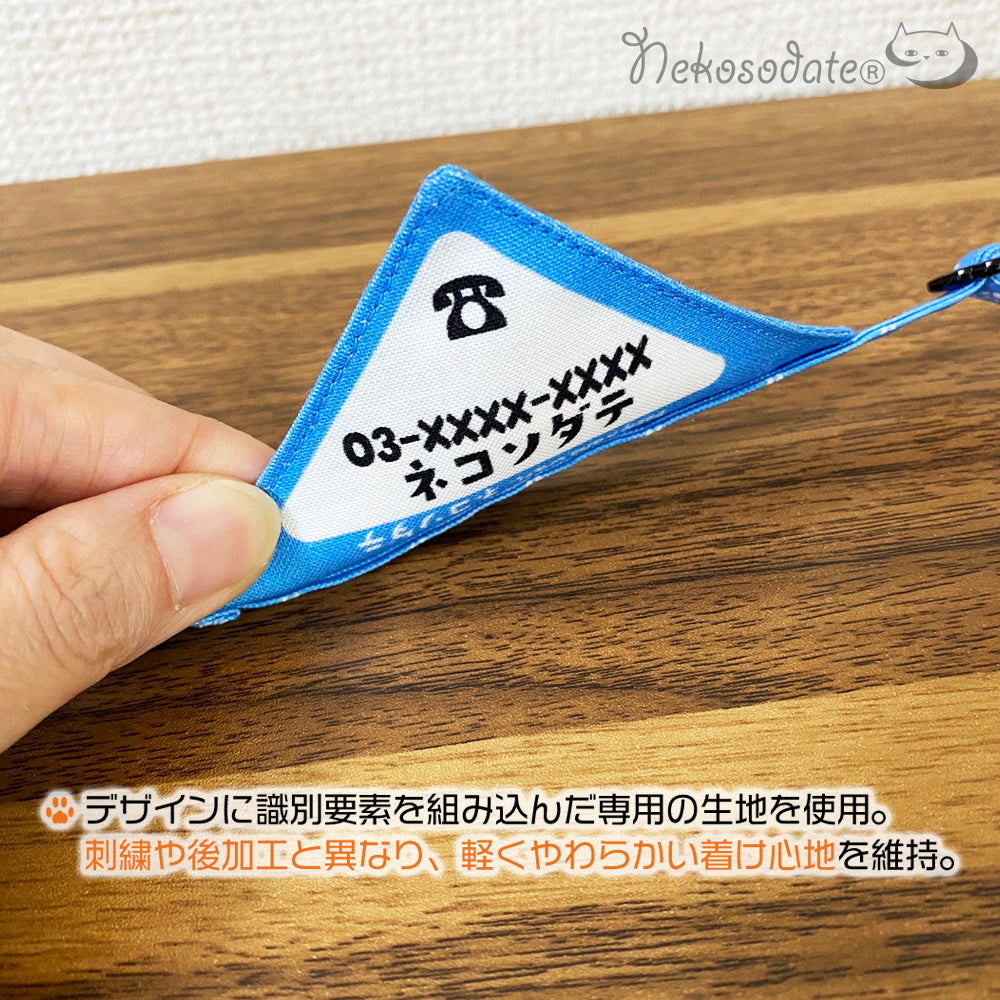 表面に猫様のお名前、裏面に連絡先をデザインとしてプリントすることにより、ネコソダテの「まじめな首輪」の軽く柔らかい着け心地を損なわずに「迷子札いらず」の首輪を実現しました。