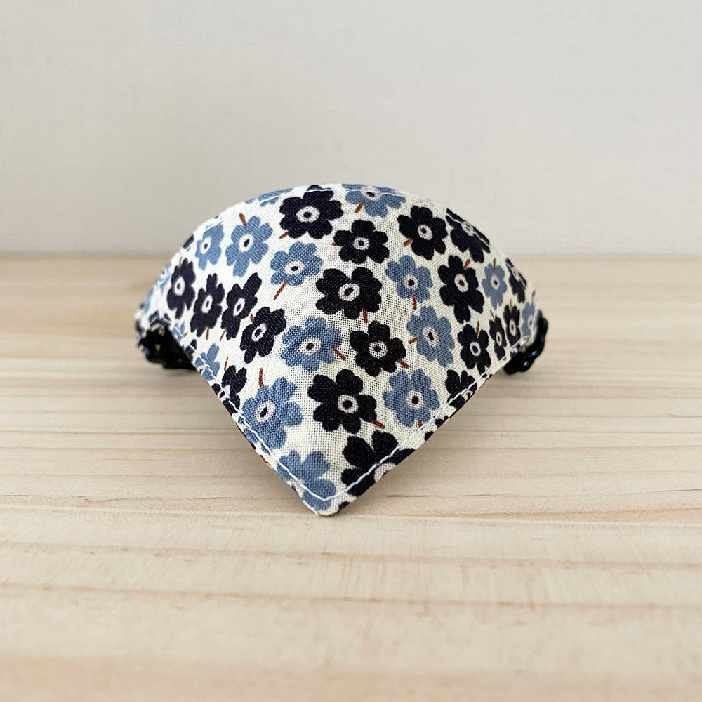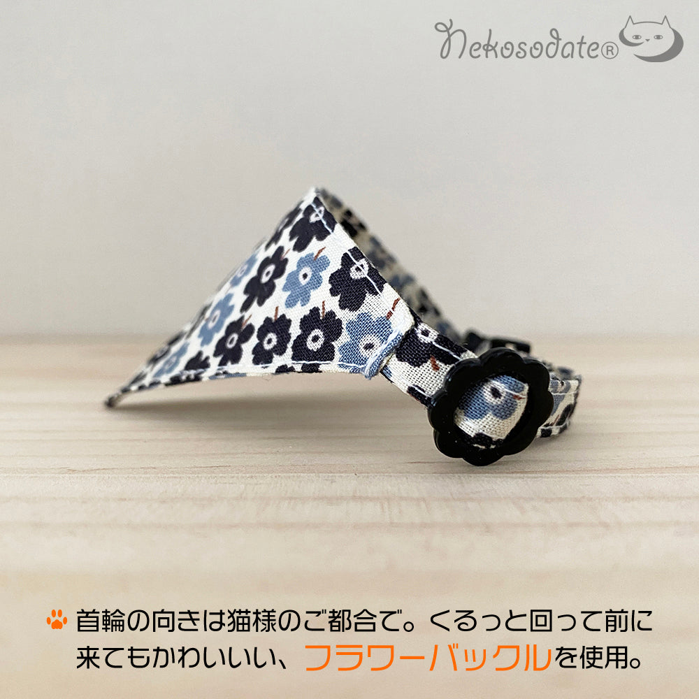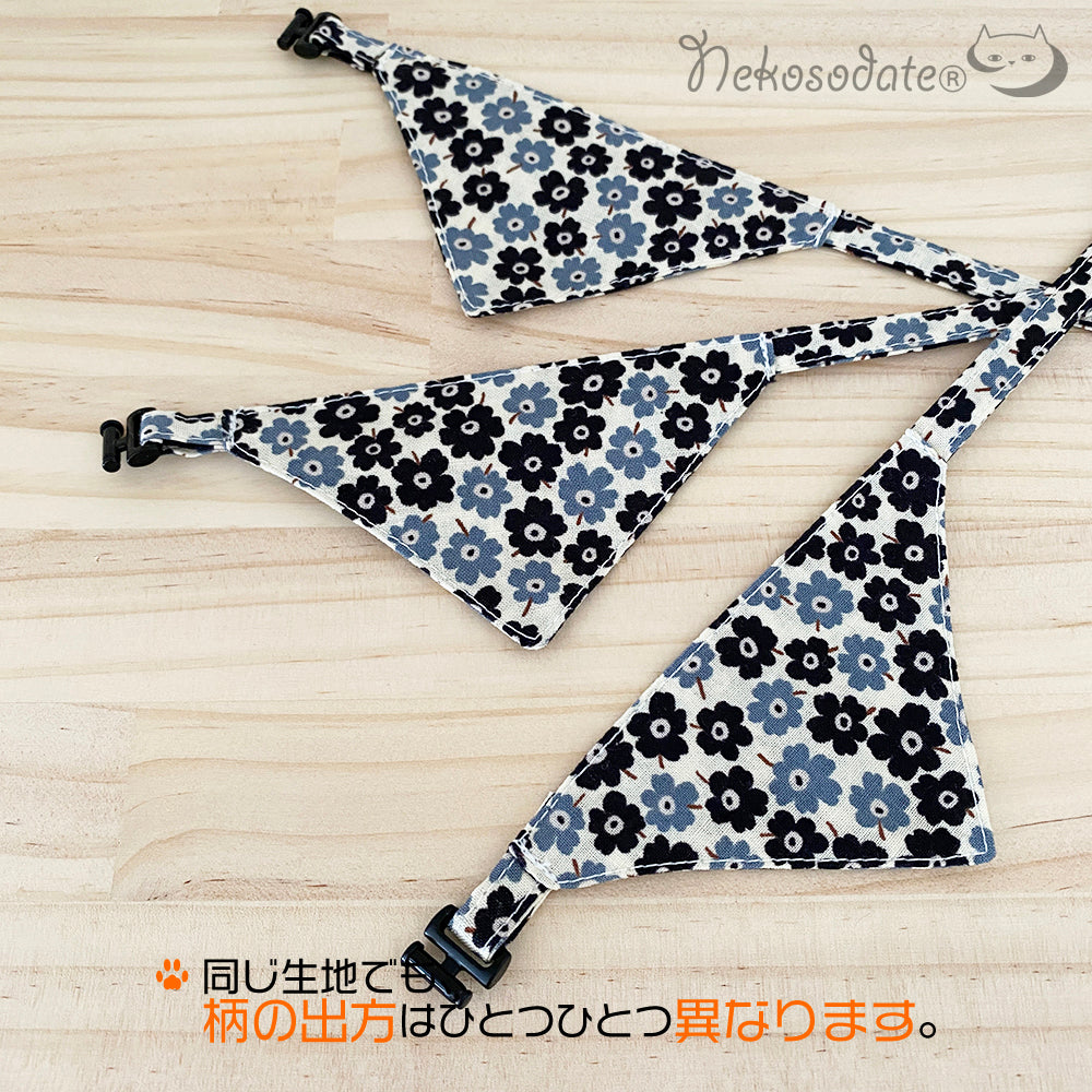 北欧テイストのフラワーモチーフが鮮やかなバンダナ風首輪です。